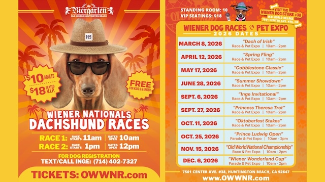The Wiener Dog Races are a special event, independently organized by K.L. Barber Productions and separate from Old World Village. For more information, including inquiries about spectator tickets and participant registration, please contact Inge at the Wiener Dog Store at 714-402-7327.